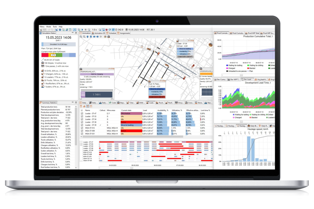 MineTwin es una moderna herramienta de simulación específica para minería que permite acelerar los tiempos de desarrollo. Está pensado tanto para proyectos puntuales como para uso continuo en planificación regular y soporte de decisiones.